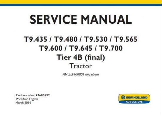 New Holland T9.435 / T9.480 / T9.530 / T9.565 / T9.600 / T9.645 / T9.700 Tier 4B (final) Tractors Service Repair Manual (North America, PIN ZEF400001 and above)