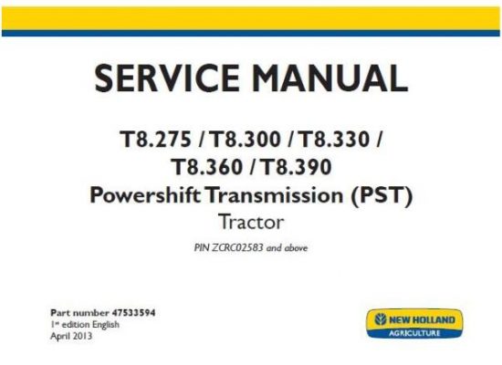 New Holland T8.275, T8.300, T8.330, T8.360, T8.390 (PST) Tractor Service Repair Manual