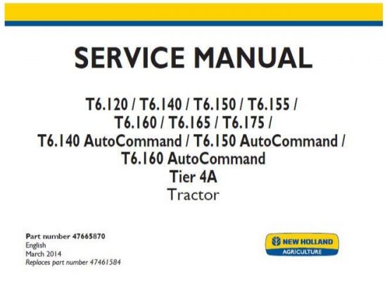 New Holland T6.120 , T6.140 , T6.150 , T6.155 , T6.160 , T6.165 , T6.175 , T6.140 AutoCommand , T6.150 AutoCommand , T6.160 AutoCommand Tier 4A Tractor Service Repair Manual