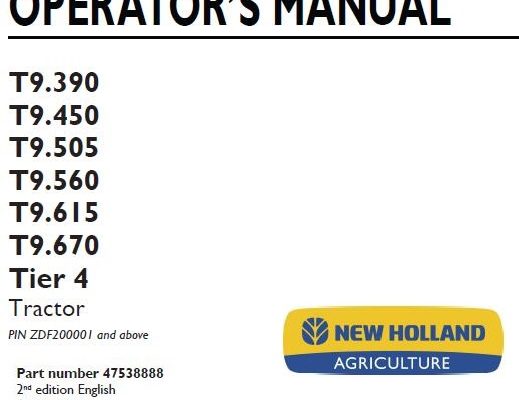 New Holland T9.390, T9.450, T9.505, T9.560, T9.615, T9.670 Tier 4 Tractor Operator’s Manual ( PIN ZDF200001 and above)