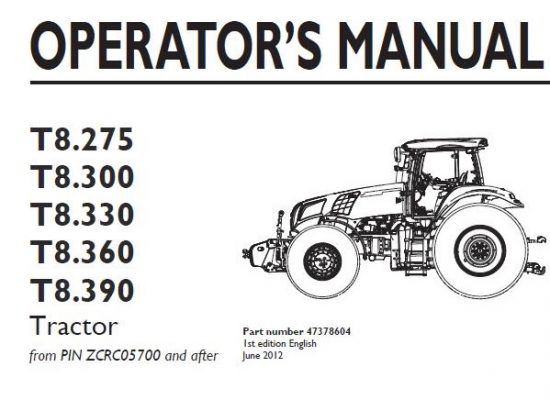 New Holland T8.275, T8.300, T8.330, T8.360, T8.390 Tractor Operator’s Manual (from PIN ZCRC05700 and after)