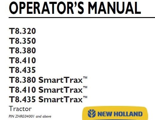 New Holland T8.320, T8.350, T8.380, T8.410, T8.435, T8.380 SmartTrax, T8.410 SmartTrax, T8.435 SmartTrax Tractor Operator’s Manual ( PIN ZHRE04001 and above )