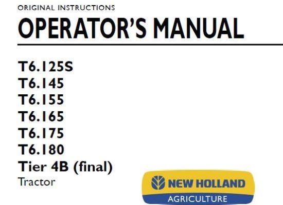 New Holland T6.125S, T6.145, T6.155, T6.165, T6.175, T6.180 Tier 4B (final) Tractor Operator’s Manual