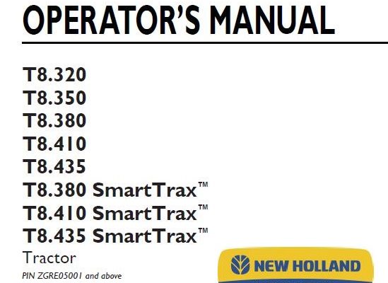 New Holland T8.320, T8.350, T8.380, T8.410, T8.435, T8.380 SmartTrax, T8.410 SmartTrax, T8.435 SmartTrax Tractor Operator’s Manual ( PIN ZGRE05001 and above )