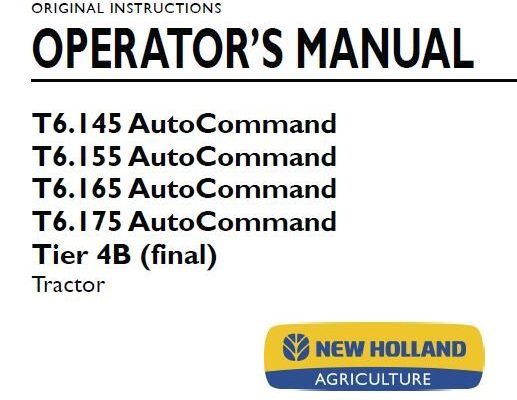 New Holland T6.145, T6.155, T6.165, T6.175 AutoCommand Tier 4B (final) Tractor Operator’s Manual