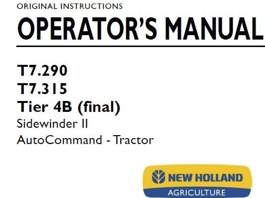 New Holland T7.290, T7.315 Tier 4B (final) Sidewinder II AutoCommand Tractor Operator’s Manual