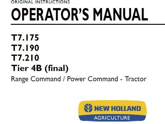 Read This New Holland T7.175, T7.190, T7.210 Tier 4B (final) Range Command / Power Command - Tractor Operator's Manual carefully to learn how to operate and service your machine…