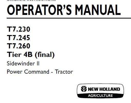 Read This New Holland T7.230, T7.245, T7.260, Tier 4B (final) Sidewinder II Power Command Tractor Operator's Manual carefully to learn how to operate and service your machine correctly. Failure…