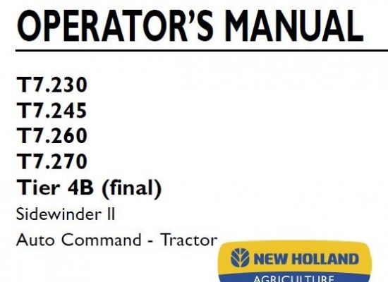 Read This New Holland T7.230, T7.245, T7.260, Tier 4B (final) Sidewinder II Auto Command Tractor Operator's Manual carefully to learn how to operate and service your machine correctly. Failure…
