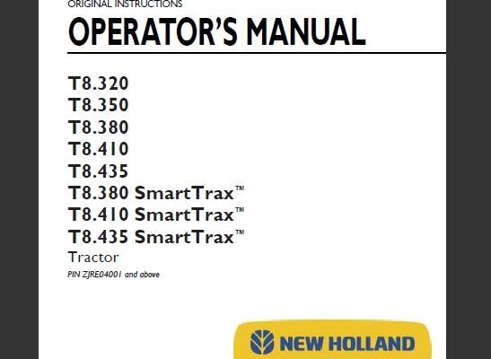 New Holland T8.320, T8.350, T8.380, T8.410, T8.435, T8.380 SmartTrax, T8.410 SmartTrax, T8.435 SmartTrax Tractor Operator’s Manual ( PIN ZJRE04001 and above )