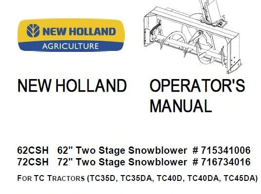 Read This New Holland 62CSH 62" , 72CSH 72" Two Stage Snowblower Operator's Manual carefully to learn how to operate and service your machine correctly. Failure to do so…