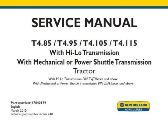 New Holland T4.85, T4.95, T4.105, T4.115 (With Hi-Lo Transmission , With Mechanical or Power Shuttle Transmission) Tractors Service Repair Manual