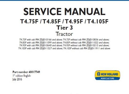 When your New Holland T4.75F , T4.85F , T4.95F , T4.105F Tier 3 Tractor needs maintenance or repair,This service repair manual is great to have. Becase it is the…